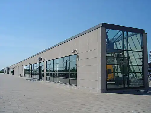 Tårnby station (Danish pronunciation: [ˈtsʰɒːnˌpyˀ stæˈɕoˀn]) is an underground railway station on the Øresund Line. It is located in Tårnby, on the island of Amager.[5] Tårnby is a municipality of its own, but its build-up parts are included in Copenhagen's urban area. Travels from this station are included in the common ticket system in and around Copenhagen. Departures take place every approximately 10 minutes in both directions.[6] The station building is owned by Sund & Bælt.[7] There are two tracks located at an island platform which is 320 metres (1,050 feet) long, around 15 metres (50 feet) wide and its tracks are located at a depth of 6 metres (20 feet) below the surrounding ground level.[7]