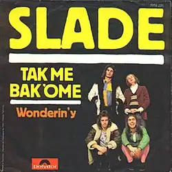 "Take Me Bak 'Ome" is a song by the British rock band Slade, released in 1972 as a non-album single. It was written by lead vocalist Noddy Holder and bassist Jim Lea, and produced by Chas Chandler. It reached No. 1 in the UK, giving the band their second number one single, and remained in the charts for thirteen weeks.[2] The song was certified UK Silver by BPI in 1972.[3][4] In the United States, the song reached No. 97.[5] The song would be included on the band's 1973 compilation album Sladest.[6]