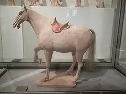 Along with guardian figures and officials, statues of horses are the main type of tomb figure that is also known in other media, such as gilt-bronze or stone, and some rich tombs also contain such figures in metal.[57] The camels may sometimes belong to tombs of people rich from trade,[58] but also seem to have been associated with wealth generally. They are often shown with heads raised and their mouths open, and in the finest models the shaggy areas at the neck and top of the legs are carefully textured in the clay. The horses are the "heavenly horses" from Ferghana in the west, which under the Tang dynasty were more common in China and ceased to be a highly prized rarity.[59] These were also made in pottery under the Han dynasty; the Tang examples are more realistic,[60] if perhaps less expressive.