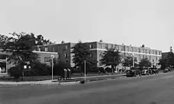 Techwood Homes was an early public housing project in the Atlanta, Georgia in the United States, opened just before the First Houses. The whites-only Techwood Homes replaced an integrated settlement of low-income people known as Tanyard Bottom or Tech Flats. It was completed on August 15, 1936,[2] but was dedicated on November 29 of the previous year by U.S. President Franklin D. Roosevelt. The new whites-only apartments included bathtubs and electric ranges in each unit, 189 of which had garages.[3] Central laundry facilities, a kindergarten and a library were also provided. Techwood Homes was demolished in advance of the 1996 Summer Olympics and is now Centennial Place Apartments.[4]