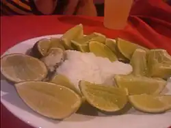 Outside Mexico, a single shot of tequila is often served with salt and a slice of lime or lemon. This is called tequila cruda and is sometimes referred to as "training wheels", "lick-sip-suck", or "lick-shoot-suck" (referring to the way in which the combination of ingredients is imbibed). The drinkers moisten the back of their hands below the index finger (usually by licking) and pour on the salt. Then the salt is licked off the hand, the tequila is drunk, and the fruit slice is quickly bitten. Groups of drinkers often do this simultaneously. Drinking tequila in this way is often erroneously called a Tequila Slammer,[53] which is in fact a mix of tequila and carbonated drink. Though the traditional Mexican shot is tequila by itself, lime is the fruit of choice when a chaser must be used.[54] The salt is believed to lessen the "burn" of the tequila and the sour fruit balances and enhances the flavor. In Germany and some other countries, tequila oro (gold) is often consumed with cinnamon on a slice of orange after, while tequila blanco (white) is consumed with salt and lime.