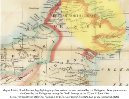 Map of British North Borneo, highlighting in yellow colour the area covered by the Philippine claim, presented to the Court by the Philippines during the Oral Hearings at the ICJ on 25 June 2001