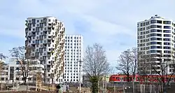 Now Fürstenried Ost, was built from 1960-1961 after an urban planning commission chose the development proposal by Architects Franz Ruf and Fred Angerer. It is located to the east of the Bundesautobahn A95. At the center of the development is the Sparkassenhochhaus, a 14 story residential building in the style of a slab high rise built in 1961 from plans of the Studio of the German Architect Fred Angerer by the architects Kurt Räder and Gerhard Feuser. The building was awarded the first prize of the Association of German Architects BDA in Bavaria in 1967.[1] At the time of completion, it was the largest single residential building in Bavaria.[2]
