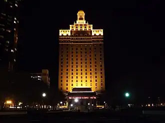 The Claridge Hotel is different from most Atlantic City resorts, because it did not grow out of a modest boarding house. It was the idea of Philadelphia architect John McShain who designed the 24-story,[1][2] 400-room hotel. Opened in 1930 during The Great Depression, the Claridge became the last of the great hotels built in Atlantic City near the Boardwalk; no new resorts rose in the city until the 1960s when a Howard Johnsons hotel was built along the boardwalk. Due to the Claridge's tall, slick, slender appearance it gained the nickname “The Skyscraper By The Sea".