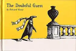The Doubtful Guest is a short, illustrated book by Edward Gorey, first published by Doubleday in 1957. It is the third of Gorey's books and shares with his others a sense of the absurd, meticulous cross-hatching, and a seemingly Edwardian setting. The book begins with the sudden appearance of a strange, penguin-like creature in a turn-of-the-century manor house. An aristocratic family struggles to coexist with the creature, who is by turns despondent and mischievous. By the final page, the guest has stayed for seventeen years, and shows "no intention of going away".