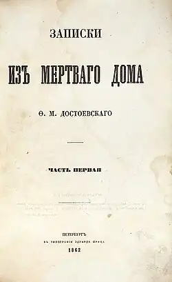 The House of the Dead (Russian: Записки из Мёртвого дома, Zapiski iz Myortvogo doma) is a semi-autobiographical novel published in 1860 to 1862[1] in the journal Vremya[2] by Russian author Fyodor Dostoevsky. It has also been published in English under the titles Notes from the House of the Dead, Memoirs from the House of the Dead and Notes from a Dead House, which are more literal translations of the Russian title.