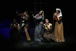 Brecht ensured that his practices would expose his audiences to the repercussions of Nazism and the social injustices that came with it.[7] He wanted to reveal the conceptual similarities between reality itself and the theatre, rather than presenting a climactic catharsis of emotion.[19] Intentionally, he sought to disrupt the customary five act structure of a conventional play, breaking up the main plot, which was originally inspired by the Russian revolutionary theatre.[20] To stifle the audiences natural curiosity, he employed audience-directed comments on the action, songs in between, and text projections with additional information that was aimed to educate them.[21]