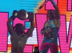 ![]() The New Day's Kofi Kingston (left) and Xavier Woods at a WWE Live tour event in 2016 | |