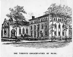 The conservatory was founded in 1886 as The Toronto Conservatory of Music and opened in September 1887, located on two floors above a music store at the corner of Dundas Street (Wilton Street) and Yonge Street (at today's Yonge Dundas Square).[5] Its founder Edward Fisher was a young organist born in the United States.[6] The conservatory became the first institution of its kind in Canada: a school dedicated to the training of singers and instrumentalists, and also to instilling a love of music in young children.[7] In its first year, it hired Italian musician and composer Francesco D'Auria to teach at the conservatory.[8]