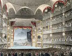 Productions relying more on scenery and effects than on dialogue and acting remained commonplace in the new facility. The 1823 production of Cataract of the Ganges had a finale featuring a horseback escape up a flowing cataract "with fire raging all around."[71] Effects for an 1829 production were produced by hydraulic apparatus that reportedly could discharge 39 tons of water.[72]