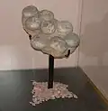 Some of the first dendroolithid eggs—which are attributed to therizinosaurs—were reported from the Bayan Shireh and Nanchao formations on the same year, 1997. These consisted of several egg clutches (a group) with an average composition of 7 or more eggs.[57][58][59] In addition, the Bayan Shireh Formation has produced fully grown, specific therizinosaurid taxa, such as Erlikosaurus and Segnosaurus.[5][25] The egg nests from the Nanchao Formation remained undescribed for several years, only being briefly examined but identified to contain fossilized embryos.[60][61] However, in 2007 these were described by paleontologist Martin Kundrát and colleagues and tentatively identified as therizinosaurids based on anatomical features such as the tooth-less premaxilla with a downturned edge, dentary with a lateral shelf, teeth with leaf-shaped crowns, humerus with a prominent deltopectoral crest, ilium with an expanded anterior end, and the elongated, sharply-pointed manual unguals. Most eggs have an average size of 7 cm × 9 cm (70 mm × 90 mm) and given these dimensions, they likely were laid by a medium-sized female. Although several egg clutches were found, one was found containing 7 eggs of which 3 of them were preserving the embryos.[62] In 2019, Hartman and colleagues were the first authors to include these embryos in a phylogenetic analysis and as expected, the embryos were recovered as therizinosaurids.[37]