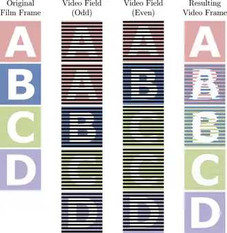 These four frames needs to be "stretched" into five frames by exploiting the interlaced nature of video. Since an interlaced video frame is made up of two incomplete fields (one for the odd-numbered lines of the image, and one for the even-numbered lines), conceptually four frames need to be used in ten fields (to produce five frames).