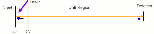 In delayed extraction of ions produced in vacuum, the ions that have lower momentum in the direction of extraction start to be accelerated at higher potential due to being further from the extraction plate when the extraction field is turned on. Conversely, those ions with greater forward momentum start to be accelerated at lower potential since they are closer to the extraction plate. At the exit from the acceleration region, the slower ions at the back of the plume will be accelerated to greater velocity than the initially faster ions at the front of the plume. So after delayed extraction, a group of ions that leaves the ion source earlier has lower velocity in the direction of the acceleration compared to some other group of ions that leaves the ion source later but with greater velocity. When ion source parameters are properly adjusted, the faster group of ions catches up to the slower one at some distance from the ion source, so the detector plate placed at this distance detects simultaneous arrival of these groups of ions. In its way, the delayed application of the acceleration field acts as a one-dimensional time-of-flight focusing element.