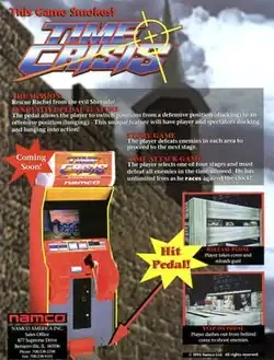 Time Crisis is a three-dimensional first-person rail shooter similar to Virtua Cop, in that the player holds a light gun and fires at on-screen enemies. However, it differs from such video games by use of its cover system - a gameplay mechanic in which players can duck behind cover to avoid enemy fire and reload their weapons. In the arcade version, a foot pedal is used to toggle between ducking and attacking positions;[7] in console conversions, a button command replicates the foot pedal's functions.[8] The PlayStation version also allows players to use the pedal from a racing wheel peripheral.[9][10]