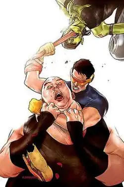 Throughout "Sabretooth and the Exiles", Toad joins the other exiled mutants on a journey to find Sabretooth that leads to him joining them as they infiltrate Orchis' mutant prisons and experimentation centers. When they end up in Station Three, which was built inside the Astral Plane, Victor and Toad get into a fight about their mission to the Orchis Forge which led to him being put in the pit. When Toad tells him it was his fault, Victor attacks him, and they fight using the special powers they have in the Astral Plane. Oya cuts them off because she discovered, someone trapped inside some kind of organic prison. Sabretooth and Toad fled, assuming the person to be hostile, but later Oya approached everyone and showed them that the prisoner was a second Victor Creed.[34] The team escapes with the freed Orchis prisoners on their boat which Maddison uses debris from the destroyed base to turn into a vessel big enough to contain them all. Sabretooth decides to enact one last plan for revenge against the Quiet Council by turning all the young mutant prisoners against Krakoa, he is interrupted when the team arrives at the final, underwater Orchis base and is hit by a tidal wave. During the commotion Sabretooth is again abducted by Orchis, telling his team to come looking for him before disappearing. The rest of the team, alongside Dr. Barrington and her creation, are trapped in the base with the kids who instinctively attack them out of fear that they are there to perform more experiments. After Nanny shuts down the brains of everyone except herself and Orphan-Maker, the team all wake up on the ship except Nanny and Orphan-Maker, Dr. Barrington and her creation, and Sabretooth who all left to pursue their own goals. Nanny and Orphan-Maker take all the mutant babies with them.[35] In Wolverine (vol. 7), Toad is killed by Sabretooth.[36]