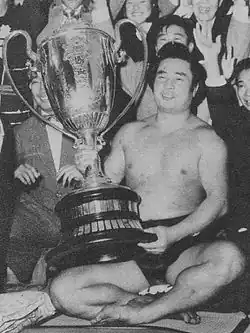Tochinishiki holding the Emperor's Cup after winning the September 1954 tournament | |