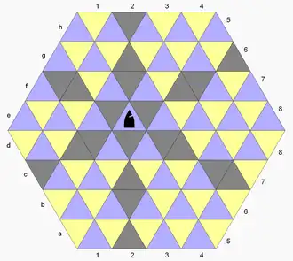 Triangular chess is a chess variant for two players invented by George R. Dekle Sr. in 1986.[1][2] The game is played on a hexagon-shaped gameboard comprising 96 triangular cells. Each player commands a full set of chess pieces in addition to three extra pawns and a unicorn.