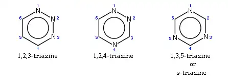 The triazines have planar six-membered benzene-like ring but with three carbons replaced by nitrogens. The three isomers of triazine are distinguished by the positions of their nitrogen atoms, and are referred to as 1,2,3-triazine, 1,2,4-triazine, and 1,3,5-triazine.
