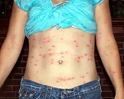 Trombiculosis is a rash caused by trombiculid mites, especially those of the genus Trombicula (chiggers). The rash is also often known as chigger bites.