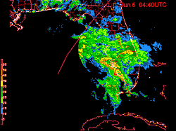 On June 5, a Hurricane Hunters flight found a closed center and winds of 40 mph (64 km/h). In response, the NHC initiated advisories on Tropical Storm Andrea later that day,[5] while centered about 310 miles (500 km) southwest of St. Petersburg, Florida.[2] Due to somewhat unfavorable conditions, significant strengthening was initially considered unlikely. Early on June 6, deep convection was displaced well to the east and southeast of the center as a result of wind shear up to 29 mph (47 km/h).[6] Despite this, Andrea intensified to attain peak winds of 65 mph (105 km/h) at 1200 UTC that day. Thereafter, unfavorable conditions, including dry air entrainment caused the storm to weaken slightly. At 2200 UTC on June 6, Andrea made landfall in Dixie County, Florida about 10 miles (16 km) south of Steinhatchee. Simultaneously, the storm attained its minimum barometric pressure of 992 mbar (29.3 inHg).[2]