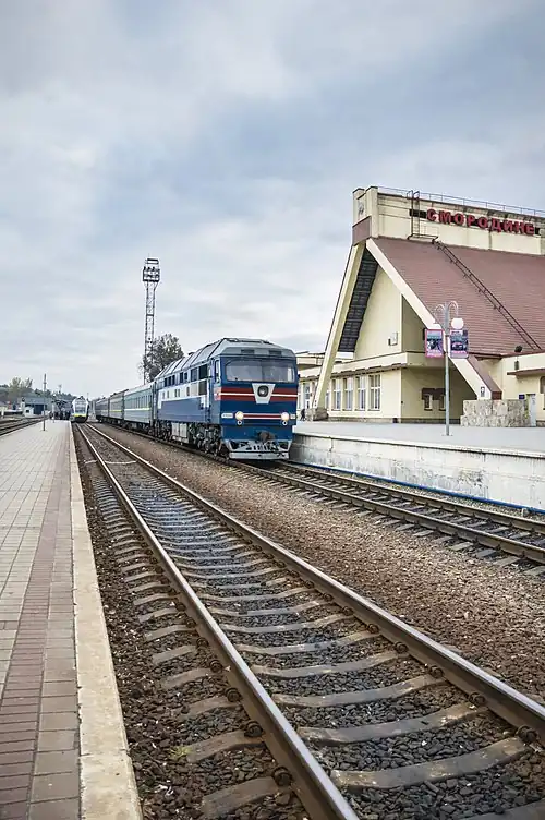 Trostianets-Smorodyne (Ukrainian: Тростянець-Смородине), until 1893 Trostianets and preceding 2018 Smorodyne is a railway station in Trostianets, Ukraine. It is a major passenger station on the Southern Railways Boromlia-Kyrykivka line and is located in the center of Trostianets.[1]