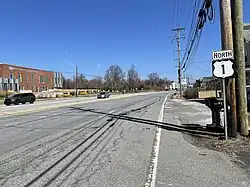 At Fallsington, the original road crossed the Pennsylvania Railroad's Trenton Cutoff on a bridge just east of the present bridge, built on a reverse curve to shorten the span. It used Trenton Road and Main Street from the bridge to the intersection with Woolston, where Main Street is now cut. In 1917, an underpass under the railroad was built to the west on Woolston Drive; this became the main route by 1924.[9][10]