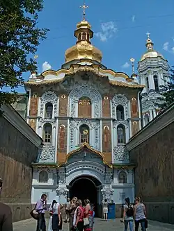Ukrainian Baroque is distinct from the Western European Baroque in having more moderate ornamentation and simpler forms, and as such was considered more constructivist. Many Ukrainian Baroque buildings have been preserved, including several buildings in Kyiv Pechersk Lavra and the Vydubychi Monastery in Kyiv. The historian Andrew Wilson has identified All Saints' Church, the Cathedral of the Assumption and the Trinity Gate within the Kyiv Pechersk Lavra as good examples of the style, along with St. Michael's Golden-Domed Monastery in Kyiv and St. Catherine's in Chernihiv.[4] The exterior of St. Sophia Cathedral in Kyiv also underwent significant alterations in the Baroque style.[5] Another example of the style is the Church of St. Elias in Subotiv, where Bohdan Khmelnytsky buried his son Tymish in 1653 after his death in battle.[6] The church is also depicted on the 5 note.