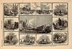 Initial railroad operations began when the USMRR rebuilt and restored service along 9 miles of the Petersburg and City Point Railroad’s line.[32][33] As the Union Army steadily extended its siege lines to the south and west, the USMRR construction corps followed in the Army's wake extending rail service from City Point to positions behind the new Union left flank. Eventually the USMRR added 21 additional miles of track which partially encircled Petersburg from the east to the southwest.[32] Parts of the USMRR extension are preserved today within the borders of Fort Gregg-Adams, Virginia, where a series of four historic markers show the route that the railroad followed behind the Union lines.[34] When Petersburg was eventually abandoned in 1865 the 25 engines and 275 pieces of other rolling stock had logged a grand total of 2,300,000 operating miles.[32]