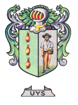 These canting arms appear similar to those of the Van Uye family of Zeeland, to whom the Uys family are not related.[19] The Uys arms are differenced from the Van Uye arms by the basket which the farmer holds; in the Van Uye arms the farmer is holding a bunch of onions (French: "une glane d'oignons"). The onions (Dutch: ui) in the dexter half of the arms are a canting reference to the Uys family name.