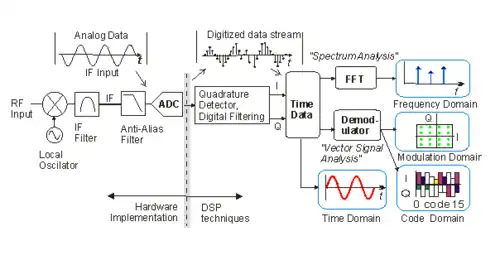 A vector signal analyzer operates by first down-converting the signal spectra by using superheterodyne techniques. A portion of the input signal spectrum is down-converted (using a voltage-controlled oscillator and a mixer) to the center frequency of a band-pass filter. The use of a voltage-controlled oscillator allows consideration of different carrier frequencies.