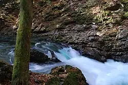 Vintgar Gorge (Slovene: soteska Vintgar) or Bled Gorge (Blejski vintgar) is a 1.6-kilometer (0.99 mi) gorge in northwestern Slovenia in the municipalities of Gorje and Bled, four kilometers northwest of Bled. It is located on the edge of Triglav National Park. Carved by the Radovna River, it is the continuation of the Radovna Valley. The sheer canyon walls are 50 to 100 meters (160 to 330 ft) high, with a total slope measuring about 250 m (820 ft). The stream has created many erosive features such as pools and rapids, and terminates in the picturesque 13 m (43 ft) Šum Falls (literally, 'noisy falls'), the largest river waterfall in Slovenia.[1]