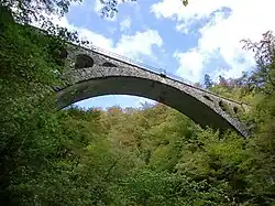 A hydroelectric dam has also been built below the gorge and an arch railway bridge for the Bohinj Railway. The bridge, built in 1904 and 1905 of cut stone, is the largest stone arch railway bridge preserved in its entirety in Slovenia. It is 65 m (213 ft) long, 4.5 m (15 ft) wide and 33 m (108 ft) high.[4]