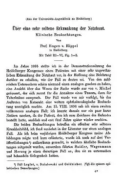 29. ^ Von Hippel E (1904). "Ueber eine sehr seltene Erkrankung der Netzhaut". Albrecht von Graefe's Archiv für Ophthalmologie. 59: 83–106. doi:10.1007/bf01994821. S2CID 22425158.