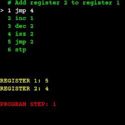 - isz *register*: Checks if the register is zero. If so, skips a line. If not, continues normally.