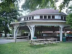 During the late evening hours of August 8, 1938, the Ravine Flyer coaster failed to clear the hill following the bridge crossing Peninsula Drive. As the train continued to travel back and forth over Peninsula Drive, passenger Mary Sersch became hysterical. Her brother, 19-year-old Clarence Sersch then rose out of his seat in an attempt to calm her. He lost his balance, which resulted in the fall to his death in the middle of Peninsula Drive.[29][30] The ride was shut down for further investigation. One investigation into the coaster determined that the ride was condemned after it was discovered that a locked wheel assembly had caused the train to lose speed over Peninsula Drive, but other reports have stated that the ride was cleared of any wrongdoing. Regardless, it was dismantled at the request of then-park owner Alex Moeller's wife, who was distraught over the incident. Ravine Flyer was replaced 70 years later in 2008 by Ravine Flyer II, in which Peninsula Drive was spanned again.[9] The ride's station still stands today, now a picnic grove known as Lakeview Grove.