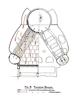 Named after its designers, the then Poplar-based Yarrow Shipbuilders, this type of three-drum boiler has three drums in a delta formation connected by watertubes. The drums are linked by straight watertubes, allowing easy tube-cleaning. This does, however, mean that the tubes enter the drums at varying angles, a more difficult joint to caulk. Outside the firebox, a pair of cold-leg pipes between each drum act as downcomers.[14]