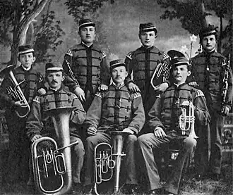 A further training opportunity offered itself during the military era. A regimental musician was not only able to improve the mastery of his instrument, but also gained an insight into a wider range of music and the possibilities for its arrangement. This proved useful for the later time as a touring musician in selecting and interpreting the pieces.[4] Hubertus Kilian from Eßweiler, for example, received such training when he did his military service in 1852 with an infantry battalion in Kaiserslautern.