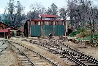 In 1972, Fiberboard Corporation (which owned Pickering Lumber Company) transferred the railroad to another subsidiary, Trimont Land Company, with the rationale that the property might be suitable as a real estate development. The plan to carve up the property did not come to fruition, and in 1976, the railroad was sold to Glen Bell, the founder of the Taco Bell restaurant chain, who invested over $10 million in the railroad.[7] This 3 ft (914 mm) gauge railroad used the lower section of the track and several steam locomotives of the West Side Lumber Company railway. The operation also offered boat rides on the old mill pond and RV parking. The theme park/railroad did not attract the anticipated number of visitors, and in 1981, Bell sold the 340-acre property to Henley Management Company for less than $500,000 and the railroad was shut down. In 1986, Quality Resorts of America bought it from Henley, and converted the property into an RV park, with limited railroad service. It sold off much of the rolling stock to other railroads, such as the Yosemite Mountain Sugar Pine Railroad, the Roaring Camp & Big Trees Narrow Gauge Railroad and the Nevada County Narrow Gauge Railroad Museum. Today, the railroad is no longer in operation, but part of the right-of-way is a hiking trail.[8][9][10][11][12]