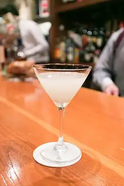White lady (also known as a Delilah,[1] or Chelsea sidecar[1]) is a classic cocktail that is made with gin, Cointreau or triple sec, fresh lemon juice and an optional egg white.[2] It belongs to the sidecar family, made with gin in place of brandy. The cocktail sometimes also includes additional ingredients, for example egg white, sugar, cream, or creme de menthe.[3]