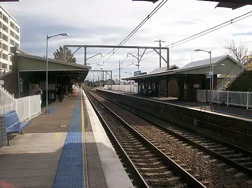The station's structure remained largely the same for the rest of the 20th century. In 1992, a footbridge connecting the two platforms across the tracks, also located at the station's eastern end, was built, allowing access between the platforms.[8] In 2007, a number of changes were made as part of the New South Wales Government's Newcastle Rail Corridor Project, a refurbishment campaign across the railway line designed to extend the life of the Newcastle railway line,[9] described by contemporary media as a "backflip" for the Iemma Government, whom originally planned to close the line altogether.[10] The changes included an extension of the station's southern platform to fit eight-car trains bound for Newcastle, new entrances to the station via the level crossing at Stewart Avenue, and an upgrade of the CCTV system at the crossing assisting the signal box.[9]