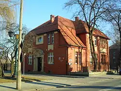 - Former parish house at 2 Kiliński Street – built after 1911 in a semi-modernist style.[19] A freestanding,[20] two-story building[19] made of red brick with plastered decorative elements. The front façade features a rectangular avant-corps, while the rear façade has two visible avant-corps.[20]