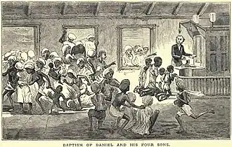 The Goobbe Mission House served as a day school during weekdays for the village children. Many adults also attended school and learnt to read and write. The mission had also started a school at Singonahully, which was Chicka the washerman's village. In early 1843, Chicka told Mr. Hardy the missionary that he desired to be baptised. Mr. Hardey, along with the native catechist Nallamuttoo questioned him on his intentions and wanted him to be sure. Chicka was also known to the other missionaries who served in Goobbe - Hardey, Sanderson and Male, and Male who was at that time stationed in Mysore was asked to perform the baptism. The baptism of Chicka took place on 13 August 1843. The ceremony was a spectacle for the villagers. When Mr. Male touched the water for baptism, the other natives fearing that water will be sprinkled on them and they would also become Christians ran for cover and exited the chapel from the doors and the windows. They continued to watch the ceremony from outside. Chicka was baptised taking up the name of Daniel, and his four sons were also baptised taking up the names of John, Peter, Timothy and Samuel. His wife was baptised after six months by Mr. Male as he was passing through Goobbe and given the name of Sarah. After their conversion, Daniel's family continued to live at the village of Singonahully. (p. 59-65).[7]