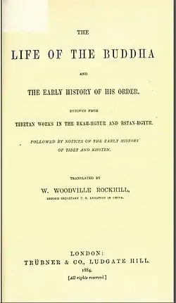The Rockhills sold the ranch in 1881 and moved to Montreux, Switzerland, where William's mother lived.[3] He spent the next three years in Europe studying Tibetan, Sanskrit, and Chinese.[2] During this period, he co-authored a biography of the Buddha with Nanjo Bunyu and Ernst Leumann, and completed a French language translation of the Prātimokṣa sūtra, published in 1884 under the title Prâtimoksha sutra; ou, Le traité d'émancipation selon la version tibétaine: avec notes et extraits du Dulva (Vinaya).[2]