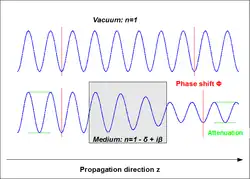 where δkz is the phase shift and e−β kz is an exponential decay factor decreasing the amplitude E0 of the wave.[8]