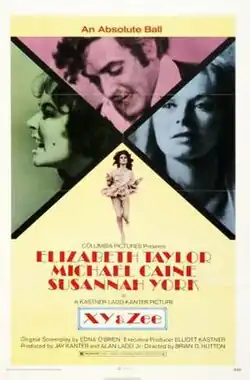 X Y & Zee (also known as Zee and Co. and Zee and Company) is a 1972 British drama film directed by Brian G. Hutton and starring Elizabeth Taylor, Michael Caine, and Susannah York. Released by Columbia Pictures, it was based upon a novel by Edna O'Brien.[1] The screenplay concerns a middle-aged, bickering couple whose marriage is near its end, and the woman who comes between them.