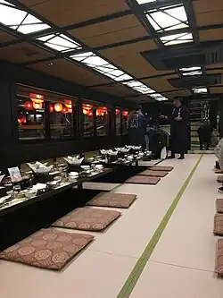 A yakatabune (屋形船) is a kind of privately owned Japanese boat that has been in use since the Heian period. Private boats of the shōgun from the Heian through the Edo periods were very lavishly decorated. Inside, a yakatabune has tatami mats and Japanese low tables that resemble an upper-class Japanese home; in fact, it means "home-style boat", and were basically for entertaining guests in the old days.