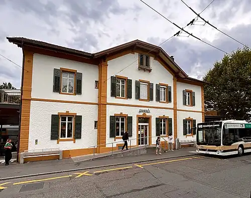 Adjacent to the station is the terminus of tram routes 2 and 4 and trolleybus route 33, all operated by Verkehrsbetriebe Zürich, the municipal transport operator for Zürich. The station is also served by regional bus routes of the Autobusbetrieb Zürich–Zollikon–Küsnacht (AZZK).[7][8][9]