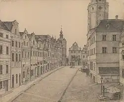 In 1428, the city was invaded by the Hussites.[3] In 1456, Bohemian king Ladislaus the Posthumous gave the city in hereditary possession to the Czech noble Podiebrad family,[3] to which it belonged until 1569. The city was heavily damaged in 1468, during the Bohemian–Hungarian War,[3] and until 1490 it belonged to the Kingdom of Hungary, before becoming again part of Bohemia. In the 16th century, the castle and defensive walls were rebuilt.[3] Trade and craft flourished.[3] In the early 17th century, the plague killed about one third of the population, and it has been speculated that the Frankenstein gravediggers scandal at that time may have inspired the Frankenstein story.[5] The Thirty Years' War (1618–1648) ended the town's prosperity.[3] Austrian and Swedish troops marched through the city, which was severely damaged.[3] Afterwards, until the late 19th century, it remained a small town.[3] In 1742 it was annexed by Prussia. In 1826, Fryderyk Chopin travelled through the town.[6]