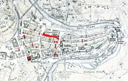 Zeughausgasse was originally called vor den Predigern after the nearby Prediger Abbey. The Dominican abbey was built throughout the 13th and 14th centuries. In 1527 the abbey was secularized and the street changed names to Beim Totentanz after a Dance of Death painting cycle by Niklaus Manuels on the abbey wall.[1] The 107.5 m (353 ft) long wall was painted with the fresco in 1520 which remained until the demolition of the wall in 1660.[2] Even though the painting was destroyed in the 17th century, the street remained Beim Totentanz until the 18th century. In 1745 it was renamed Zeughausgasse and widened. The Zeughaus or armory, that the street was named after, had originally been a workhouse for the abbey and occupied what would become Zeughausgasse 18-28, Nägeligasse 4-6 and 7-13. In 1876 the old armory was demolished[3] and in 1880 the street was widened.