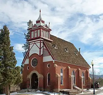 a distinctive red brick building with stone trim and a steeply-pitched, wood shingle roof. The building has decorative gabled trim, pointed-arch windows, buttressing, and a central tower/narthex with an elaborate roof and a round arched entry below a large rose window. Stylistically, the eclectic composition almost defies classification. Predominantly Victorian Gothic, the church also possesses elements of other styles from the Late Victorian era, including Romanesque Revival, the Stick Style, and Queen Anne with some Germanic influences.[2]
